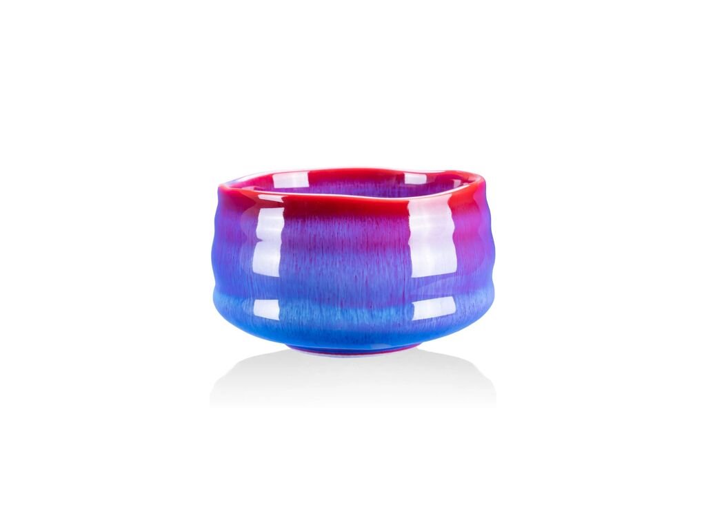 Miska Seiun na matchu je velká, těžká obřadní mísa v tradičním designu Hantsutsu-gata (objem 430 ml). Její glazura zobrazuje jemně vyladěnou souhru tmavých červenofialových a chladných modrých tónů, které se jemně prolínají a připomínají večerní oblohu za soumraku. Lesklý povrch dodává hloubku a klidný, elegantní vzhled. Velkorysý objem nabízí dostatek prostoru pro servírování matchy; hmotnost zajišťuje stabilní stojan. Ideální pro kavárny, čajovny a luxusní prodejny, které chtějí spojit autentickou přípravu čaje s estetickou prezentací.