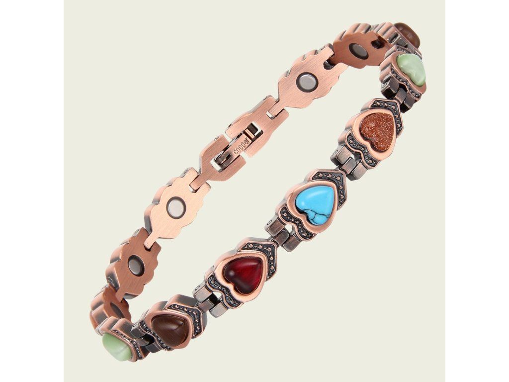 Náramek vyrobený z čisté mědi (99,9%), 100% hypoalergenní, bez slitin ani mosazi, s průhledným povlakem. Obsahuje neodymové magnety o síle více než 2500 gaussů a drahé kameny (zelený nefrit, křišťál, avanturín, tyrkys). Součástí balení je krásná šperkovnice a sada na zkracování.